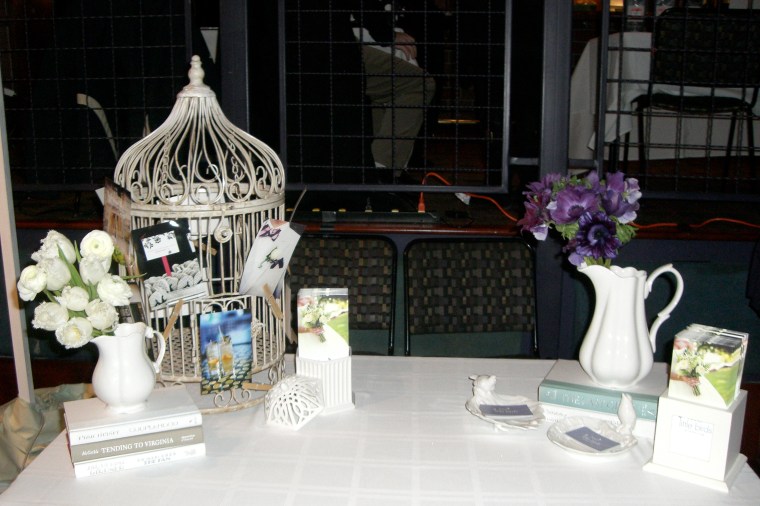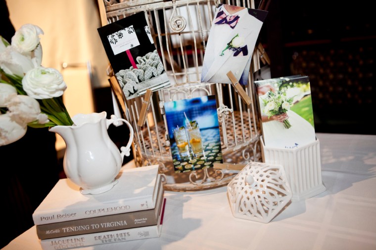 Our table was simple and vintage inspired, featuring a birdcage with photos of our work, beautiful old books from Collingswood Book Trader, antique pitchers with flowers from Michael Bruce, and adorable bird dishes for our business cards.