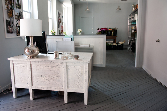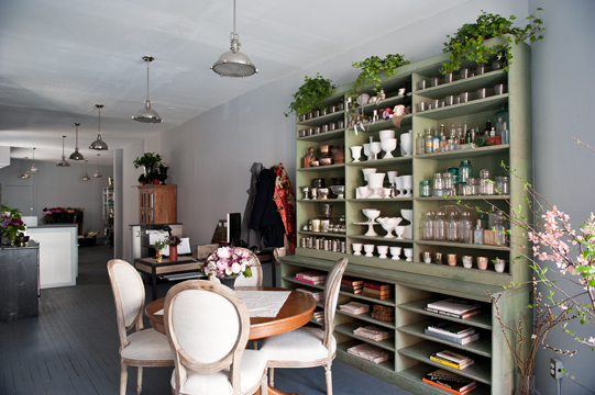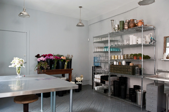 Nestled on Bainbridge Street between 5th and 6th, Sullivan’s studio is beyond adorable. The walls are the perfect shade of gray (Martha Stewart Living paint in Dolphin) and we love the bookcase filled with her event vases, which are all available to rent. Our favorites are the milk jugs and antique vases.