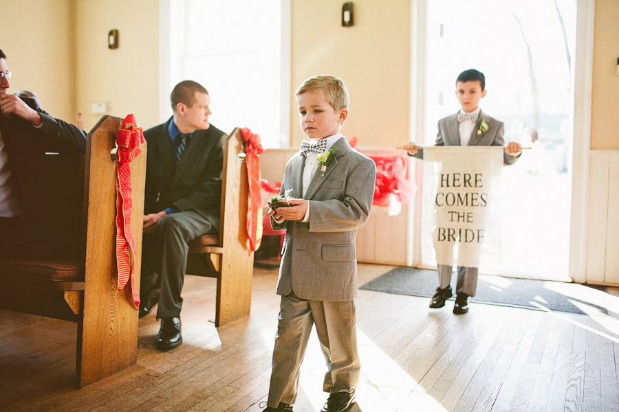 We came across these shots on photographer Pat Furey’s blog and had to share. We love everything about them… the expressions on the little guys’ faces, the bow ties, the boutonnieres, the nest ring holder, the “here comes the bride” and “just married” signs, everything!